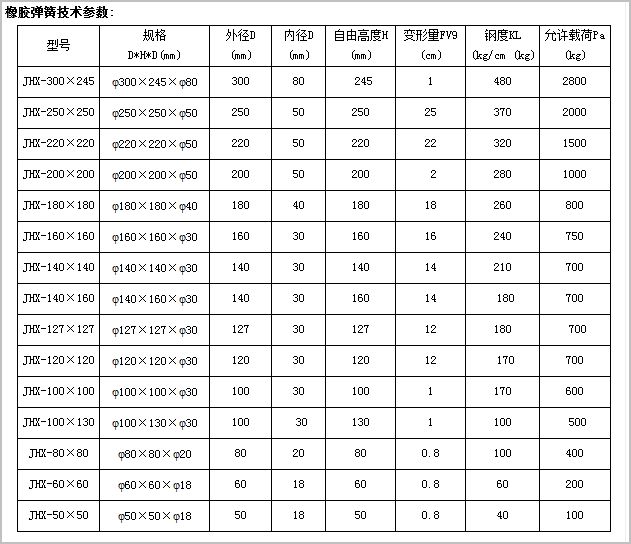 橡膠彈簧技術參數(shù):